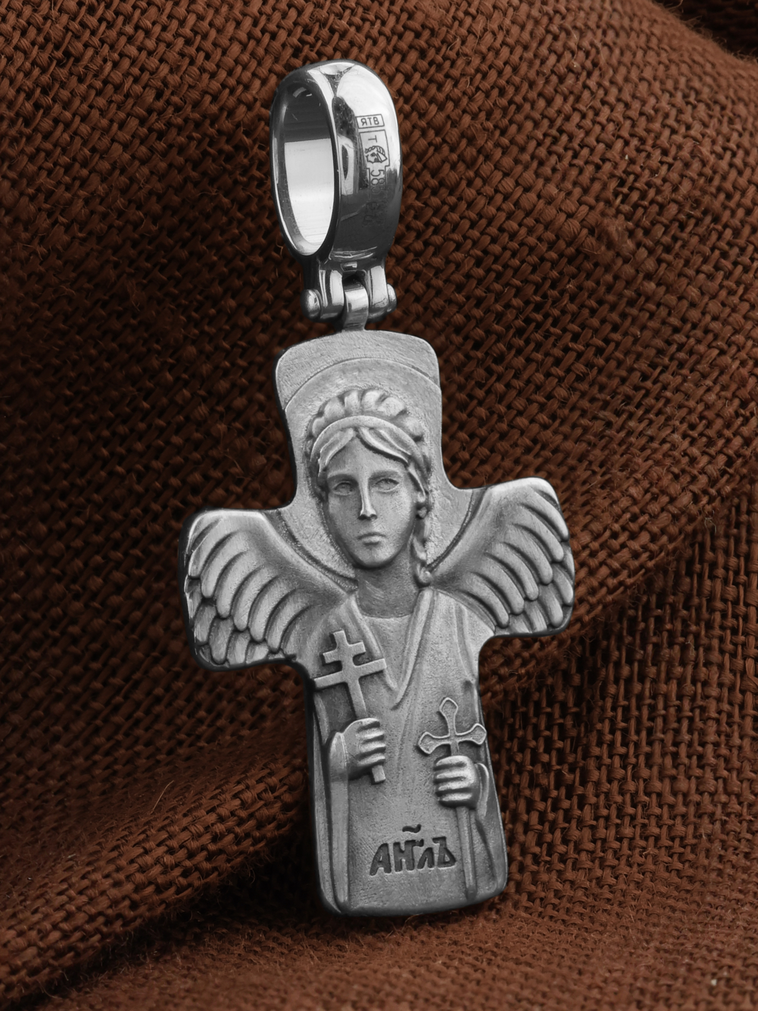На оборотной стороне креста изображен Святой Ангел-Хранитель держащий в правой руке крест, а в левой — меч. Ангел-Хранитель — это Ангел приставляемый Богом к человеку при крещении для охраны и помощи в добрых делах. Он невидимо находится при человеке на протяжении всей его жизни, если человек сохраняет в себе любовь к Богу и истинную веру перед Ним. Ангел-Xранитель делают для нас все, что служит к истинному нашему благу и спасению. Невидимо пребывая при нас постоянно, он, руководствуя нас ко спасению, не только по нашему желанию таинственно наставляет нас на все доброе и полезное, не только возносит наши молитвы к Богу, но еще и сам от себя охраняют и защищают нас от врагов видимых и невидимых и ходатайствует за нас пред Богом.