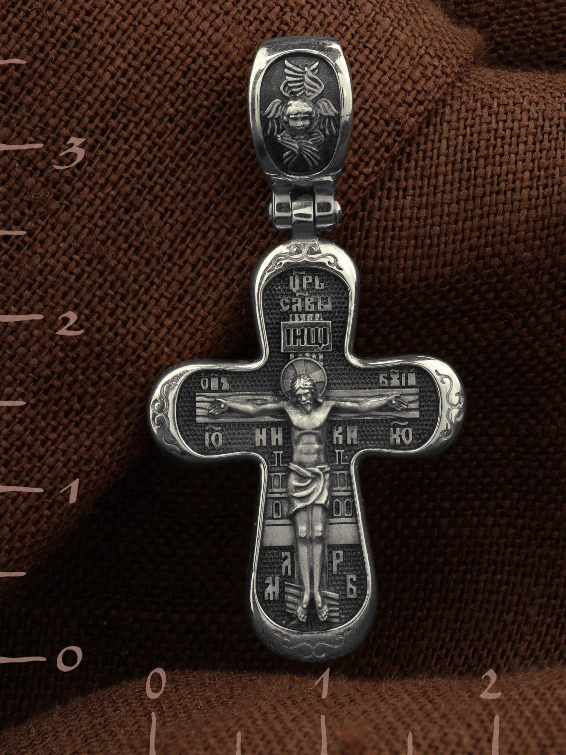 Центральную часть лицевой стороны занимает Распятие Христа — образ жертвы, принесенной Господом за грехи людей. Именно ко Христу, сошедшему на землю ради нашего спасения, возносятся все молитвы. Над титлом видим слова «ЦРЬ СЛВЫ» — Царь Славы. Верхняя перекладина символизирует собой табличку с надписью «IHЦI» — Иисус Назарянин Царь Иудейский. Над перекладиной пишется словосочетание «СНЪ БЖIЙ» — Сын Божий, ниже перекладины добавляется: «НИКА» (греч. — Победитель), рядом пишется сокращенно имя Спасителя «IC XC» — Иисус Христос. Буквы «МЛ» «РБ», написанные в нижней части креста, означают: «Место Лобное Рай Бысть». Возвышение, на котором стоит Крест, символизирует гору Голгофу, на которой произошло Распятие. У подножия Креста изображают прах Адама, обозначенный черепом.